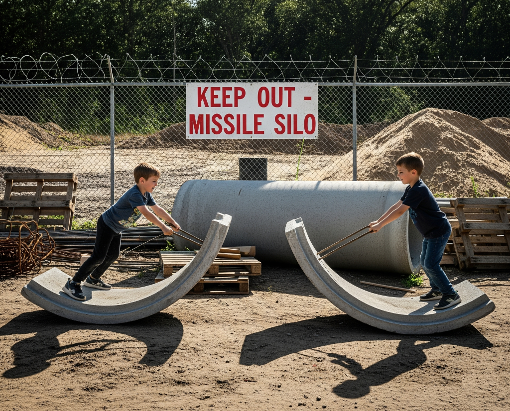 So yes, my experience with stitches and physical injuries was pretty solid, and Rambo’s expert self-surgery left an impression. Not more than a few weeks after watching that movie with my dad and brothers, I was out playing with my friend, Steven. We had wandered back through the woods and into a construction site. It’s probably relevant to mention that this was not a site where they were building an office. This was on a Strategic Air Command Air Base in the heat of the Cold War in 1982. This construction site was the location of a Minuteman Missile silo. There were stacks of semi-cylindrical concrete slabs that would form the silo itself.